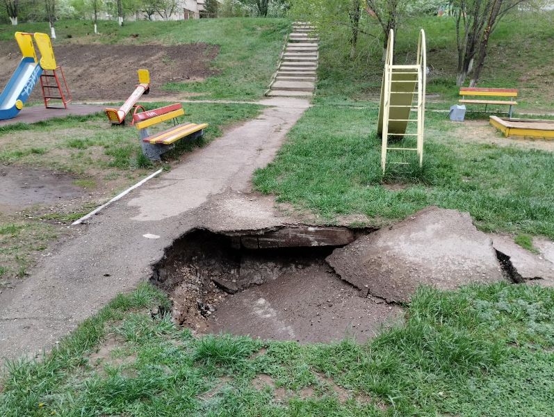 В начале мая на одной из указанных опасных площадок на ул. Коммунистической, 38 произошёл провал грунта, который подмыло водой после утечки.